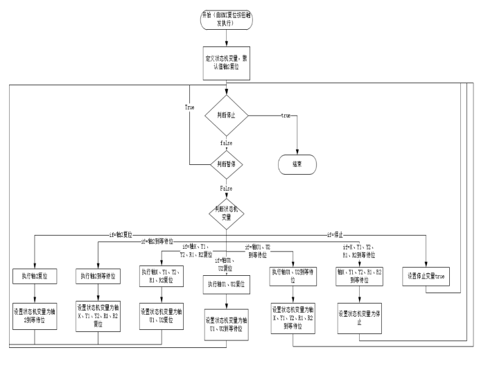 制作设备动作逻辑之前首先要实现8轴设备复位工作,设备流程以及流程图如下: