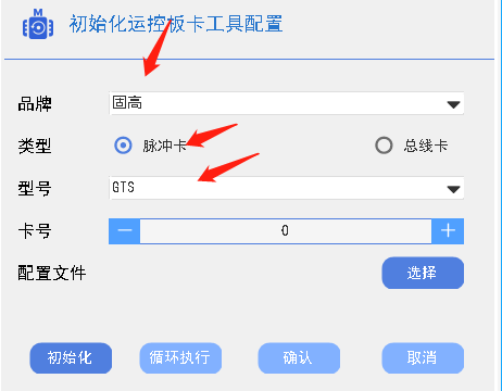 设备使用固高GTS系列运动控制板卡,“初始化运控板卡”算子配置界面上“品牌”项下拉列表选择“固高”,GTS属于脉冲卡,类型项选择“脉冲卡”,“型号”下拉列表选择GTS。本项目使用的是8轴卡,只使用一张运动控制板卡,卡号设置为“0”。如存在多个板卡,可配置板卡卡号。