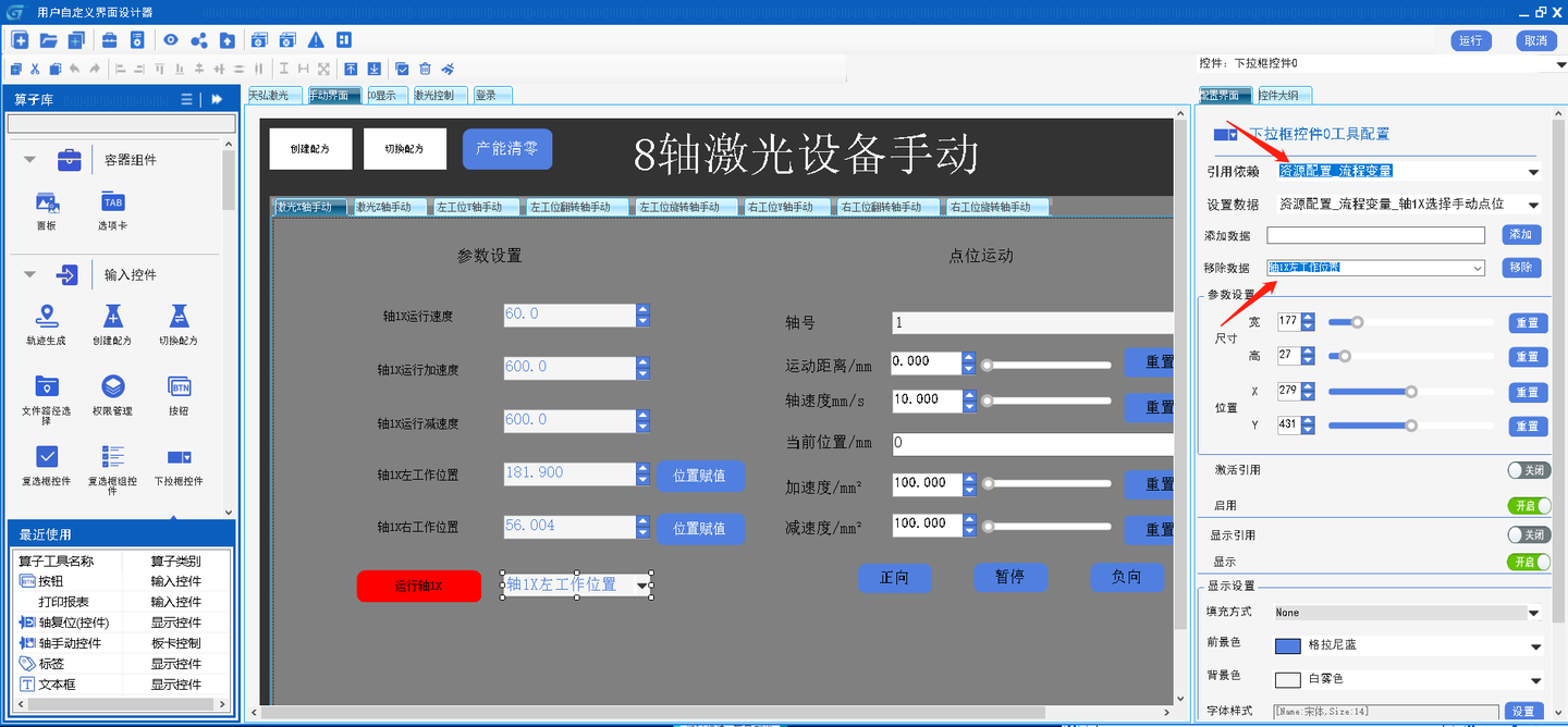 点位测试:点位测试功能通过HMI按钮控件与下拉列表按钮控件实现,如激光X轴中的点位测试功能,配置要测试移动的点位名称,绑定资源管理器定义的变量,通过下拉列表选择数据时会将选择项给到绑定变量中。