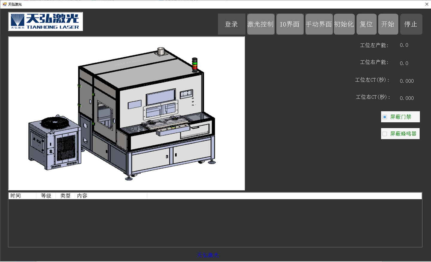人机交互界面需要实现设置权限管理、设备开始、停止、复位、初始化、记录产能、记录CT、日志显示、IO显示、手动控制等功能,因此将界面分为权限管理、IO显示、手动控制、激光控制以及主界面,HMI默认只有一个窗体,通过窗体按钮增加4个窗体,配置每个界面的背景色一致