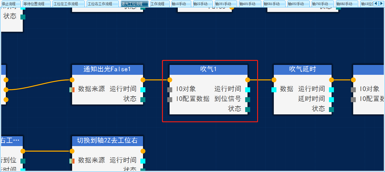 轴2Z轴回到等待位:关闭吹气后控制轴2Z轴到等待位置,使用轴控制(自动)算子实现,并通知工位左/右已经到位。