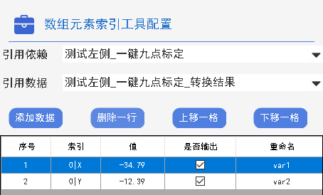 通过数组元素索引算子提取出坐标转换后的XY值,引用一键九点标定算子转换结果,添加到配置表格将是否输出列打“√”,完成XY值提取