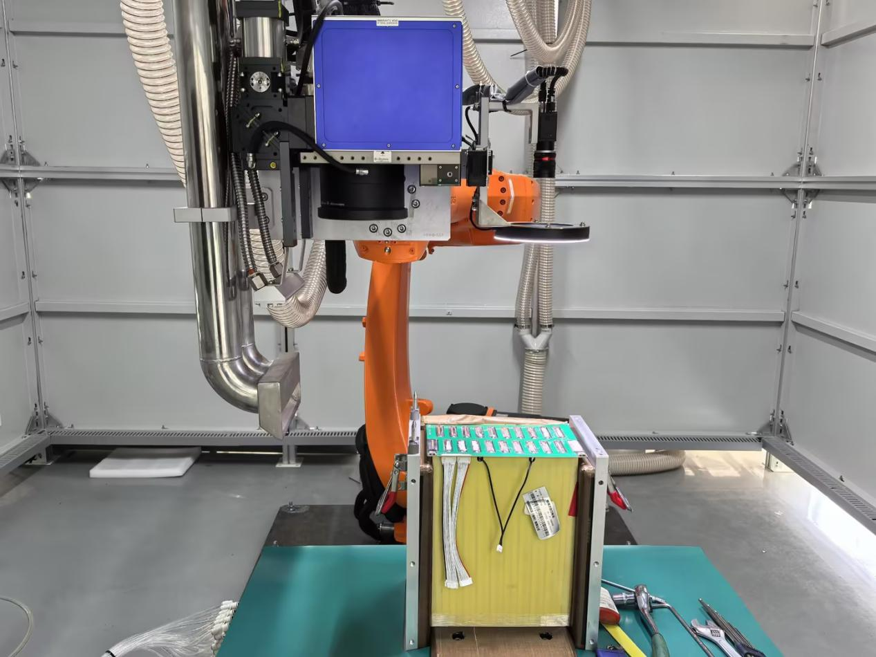 设备用于通过视觉定位智能算法实现高精度极耳焊接。相机精准捕捉锂电池两端角位置,结合焊接点偏移参数,实现极耳寻址,自动计算21条焊接点空间坐标并实时传输至PLC,适配多规格锂电池焊接需求。
