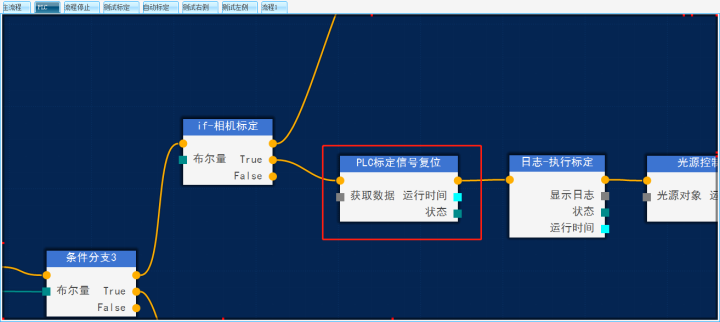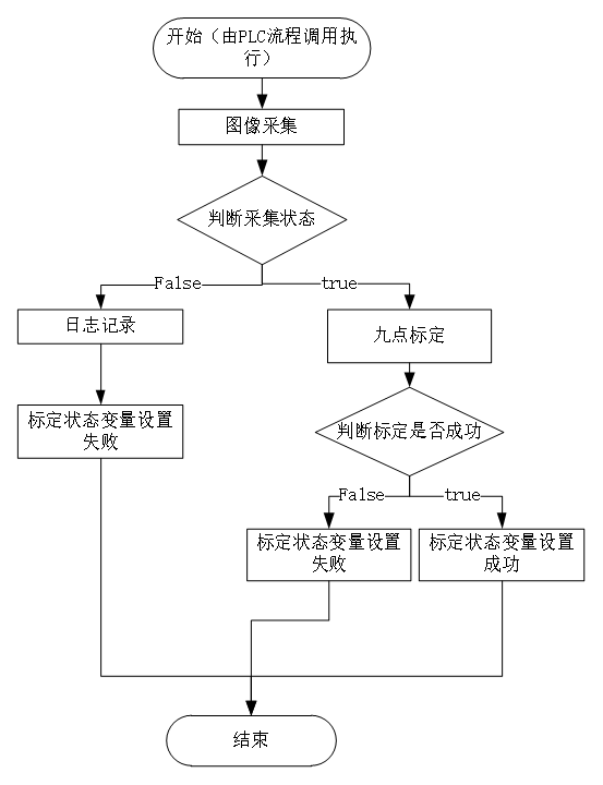坐标进行转换后需要使用条件分支对一键九点标定算子状态进行判断,防止可能出现标定文件丢失等情况出现导致焊接异常,状态异常通过日志记录并修改相机处理状态变量反馈给PLC流程