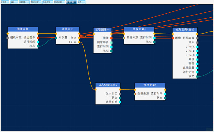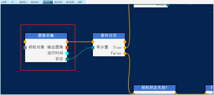 步骤2.判断采集状态:通过条件分支判断图像是否采集成功,如果不成功使用日记记录并将相机处理状态变量赋值为2,PLC流程通过多分支工具对此变量进行判断从而确定右侧定位失败