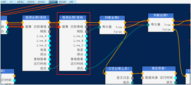 步骤6.判断Y方向直线定位是否成功:通过条件分支引用步骤5检测直线算子状态变量判断检测是否成功,检测成功程序继续执行,检测失败使用日志记录并将相机处理状态变量设置为2,反馈到PLC流程