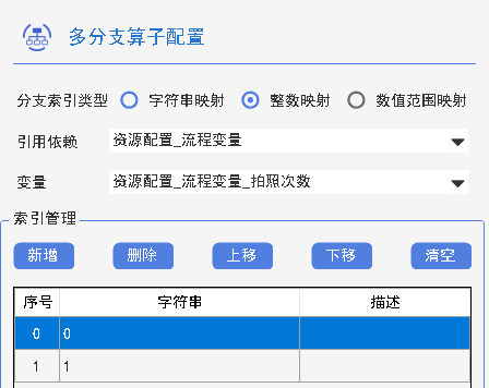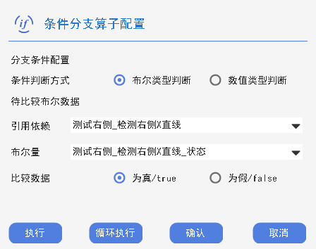 通过多分支工具判断拍照次数变量值,当此变量值为0时表明设备将在右侧进行拍照,配置如下: