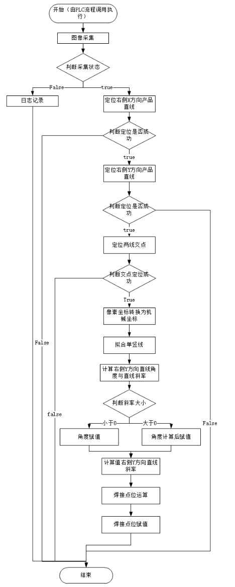步骤11.焊接点位运算:计算前根据Y方向直线斜率大小计算出使用角度,通过条件分支判断斜率大小,动态调整运算角度,确保根据产品实际摆放将焊接点位置发送给机械手,判断斜率是否大于0,大于0,将步骤10计算出的角度通过修改变量算子修改到角度变量中