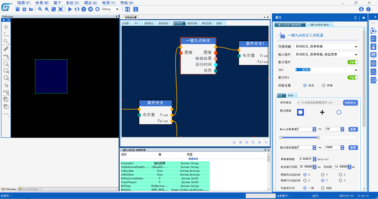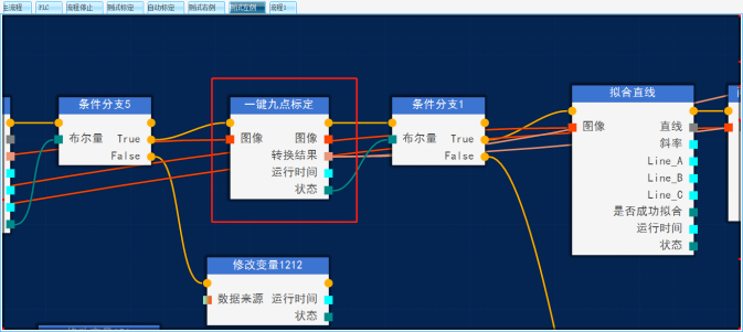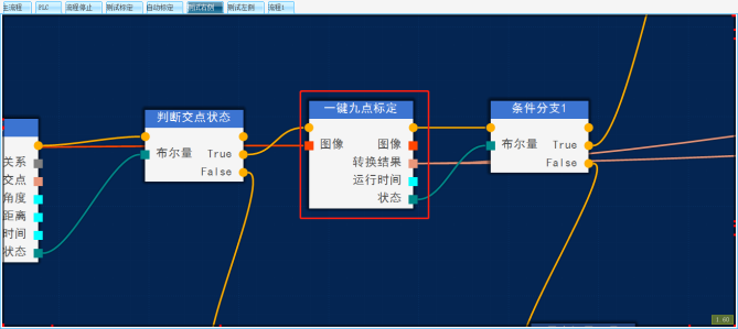 步骤4.判断标定是否成功:通过条件分支算子判断一键九点标定算子状态,标定失败将标定状态变量设置为2