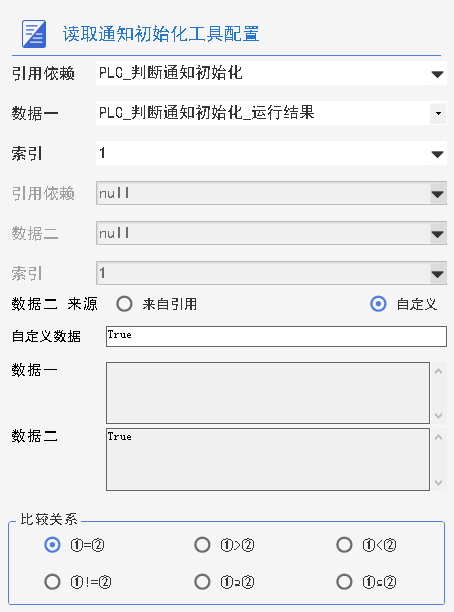 使用文本对比算子引用转换结果与文本True做对比(与PLC规定此寄存器地址为True时表明需要初始化)