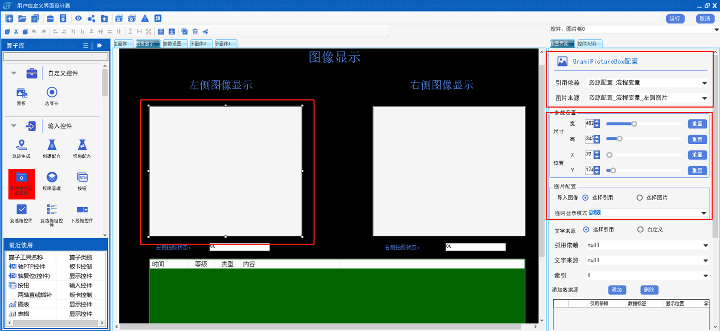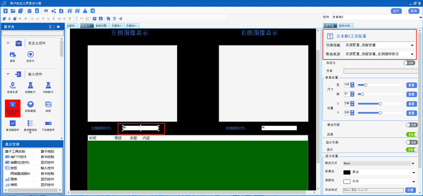 定位图像显示:通过图片框控件显示定位时采集的图像,例如左侧图像显示,控件引用左侧图片变量,调整显示位置、尺寸以及图片显示方式实现,当左侧图片变量发生改变时图片框自动刷新