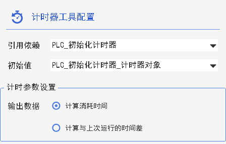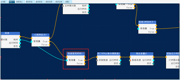 步骤6.记录当前时间:当给心跳地址写入true后需要间隔一段时间才能写入false,先通过码表算子记录时间,引用初始化计时器算子