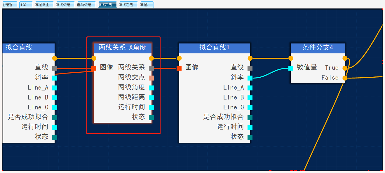 步骤10.计算右侧Y方向直线角度和斜率:角度通过拟合步骤9拟合出的单竖线以及检测Y方向直线获取,使用两线关系算子引用这两条直线,自动运算出两线夹角角度