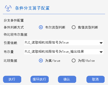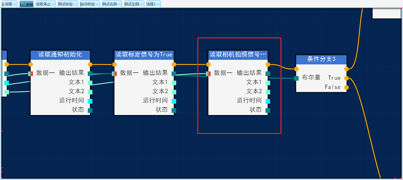 使用文本对比算子引用转换结果与文本True做对比(与PLC规定此寄存器地址为True时表明需要拍照定位)