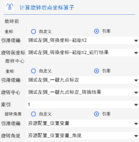使用计算旋转后点坐标算子计算实际焊接点位置,将理论设计位置(虚拟坐标)转换为实际物理空间中的焊接位置,补偿软包电池摆放造成的位置偏差,算子以转换坐标为旋转中心,虚拟坐标为旋转前坐标,旋转角度引用角度变量,得到起始焊接点位置,左侧计算10组焊接点,后续9组焊接点使用流程相同