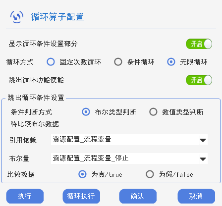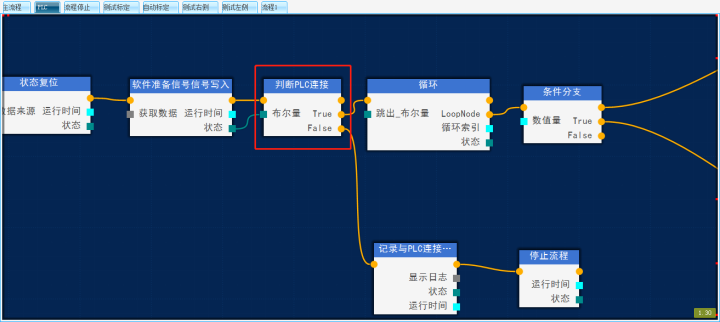 步骤4. 判断是否停止:前三步已经将准备工作制作完,实际使用时操作员点击软件开始按钮后即可为实现长时运行,因此使用循环算子将后续动作循环执行,当操作员点击停止时再将循环退出,配置引用停止变量,当按下停止时执行停止流程,即可结束运行