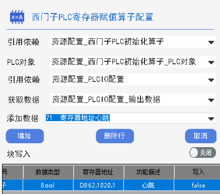 步骤3. 发送视觉软件准备OK:使用西门子PLC寄存器赋值算子给PLC提供准备OK地址赋值,算子引用资源管理器内的西门子PLC初始化与PLCIO配置算子输出资源,通过地址信息下拉列表找到准备OK地址,加到表格内,发送true,PLC接收到设备继续运行。