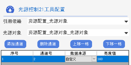 标定前需要先控制光源亮度,使用光源控制算子,算子引用资源管理器光源对象资源实现光源控制,设备光源使用通道号为2,控制通道2亮度为160