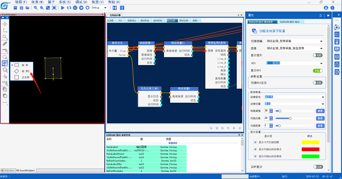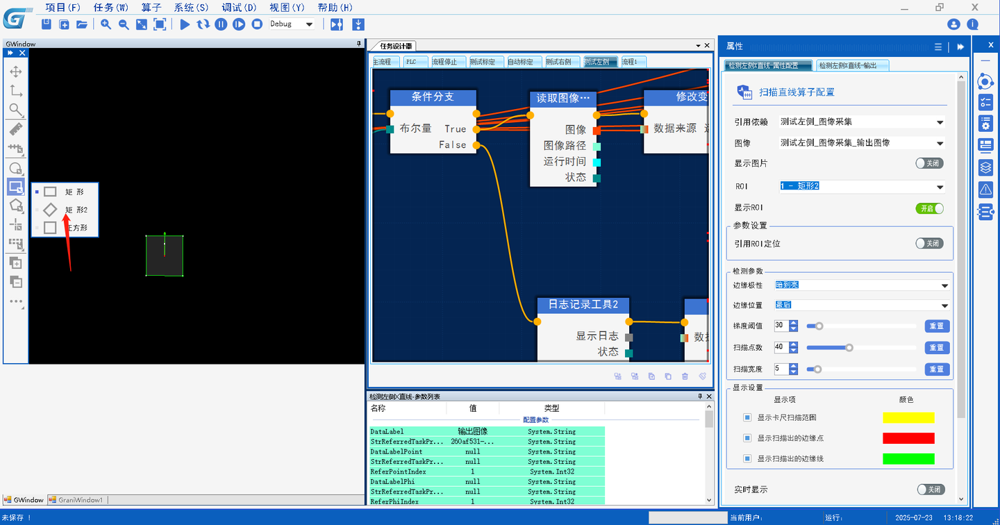步骤3.定位左侧X方向产品直线:通过扫描直线算子检测电池边缘,扫描直线算子引用采集到图像,在图像显示窗口使用矩形2ROI将边缘线框住根据电池边缘打光效果,设置扫描直线算子边缘极性为暗到亮,边缘位置为最后,算子扫描到线段将线段数据输出