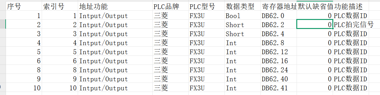 (5)打开存储的路径文件,根据实际进行修改,地址功能填写寄存器地址是用于读取还是写入,读取填Intput,写入填Output,两种都需要则填写Intput/Output,PLC品牌列填写使用PLC厂商,PLC型号列填写PLC具体型号,数据类型填写寄存器地址的数据类型,寄存器地址填写要通讯的寄存器地址编号,默认缺省值填写默认寄存器地址,功能描述填写寄存器地址实际作用