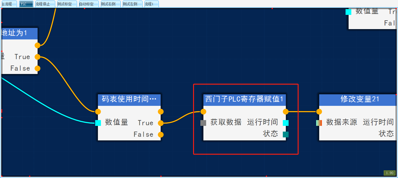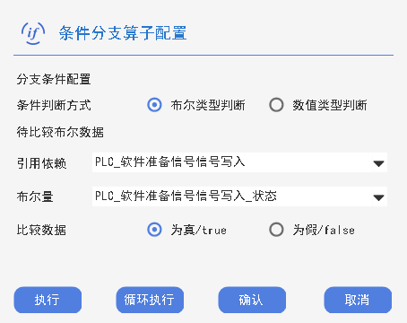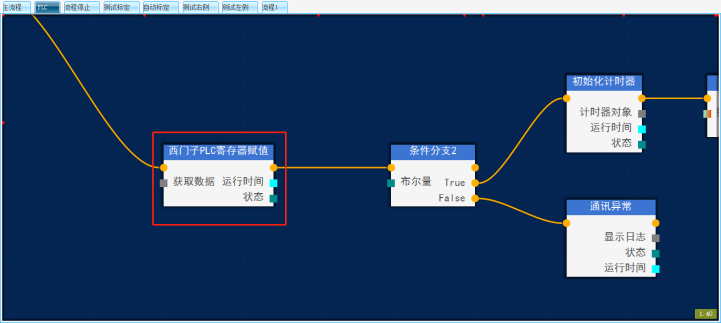 步骤4. 判断发送成功:使用条件分支算子判断西门子PLC寄存器赋值算子输出状态,状态为true表名写入值成功,状态为false表名写入失败。