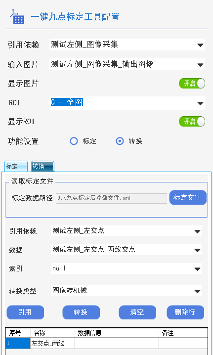 步骤8.像素坐标转换为实际坐标:通过一键九点标定算子实现坐标转换功能,算子具备标定和像素坐标转机械坐标功能,算子导入标定文件以及引用两线交点坐标,选择图像转机械,即可输出产品角点在相机视野中的物理坐标