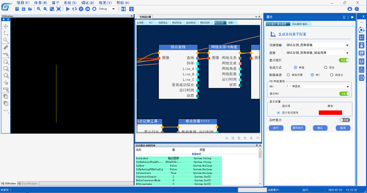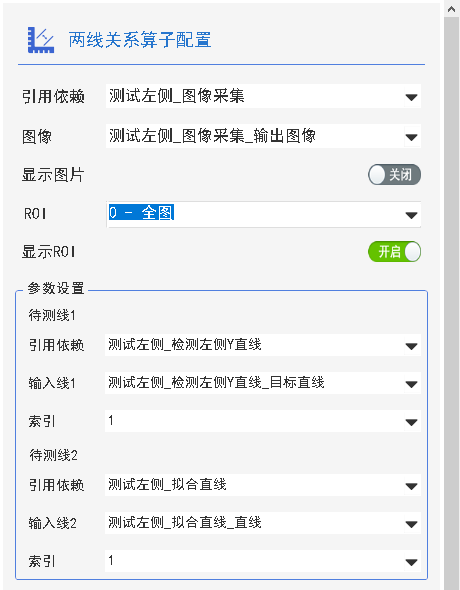步骤10.计算左侧Y方向直线角度和斜率:角度通过拟合步骤9拟合出的单竖线以及检测Y方向直线获取,使用两线关系算子引用这两条直线,自动运算出两线夹角角度
