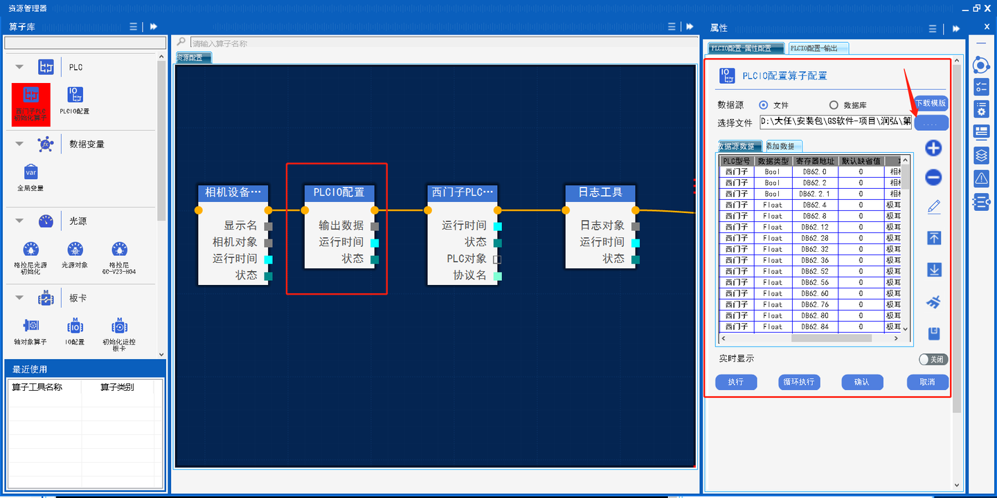 通过PLCIO配置算子导入配置过的PLC文件为主任务设计器制作寄存器写入和读取做准备。