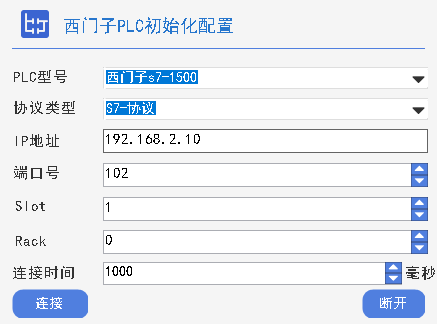 设备使用西门子S7-1500PLC,需使用S7协议交互,通过PLC初始化算子选择PLC型号为,协议类型为S7协议,输入IP和端口号,完成连接功能