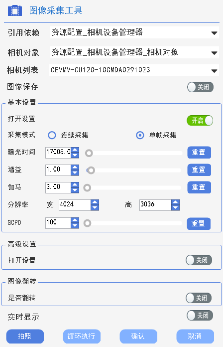 步骤1.图像采集:通过面阵相机算子实现采图,算子引用资源管理器内相机资源管理器算子输出的相机对象,相机列表选择设备相机名称,采集一张图进行定位即可,设置采集模式为单帧采集,配置曝光时间、伽马等参数