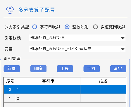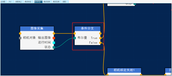 再判断相机标定状态结果,当标定状态为1时表示标定成功;当标定状态为2时表示标定失败,使用多分支工具引用相机标定状态,增加两个分支,分别为1和2