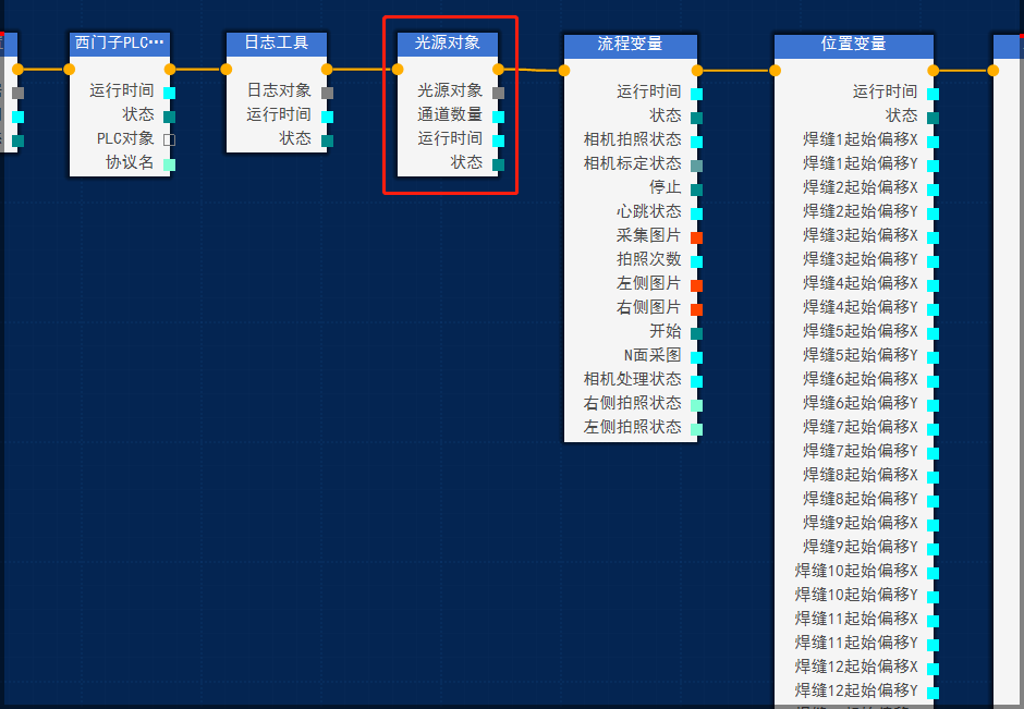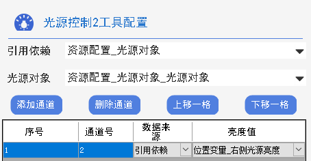 当拍照次数变量值为1时表明设备将在左侧进行拍照,使用光源控制算子配置通道2光源亮度来自左侧光源亮度变量,左侧光源亮度变量值由HMI界面传递
