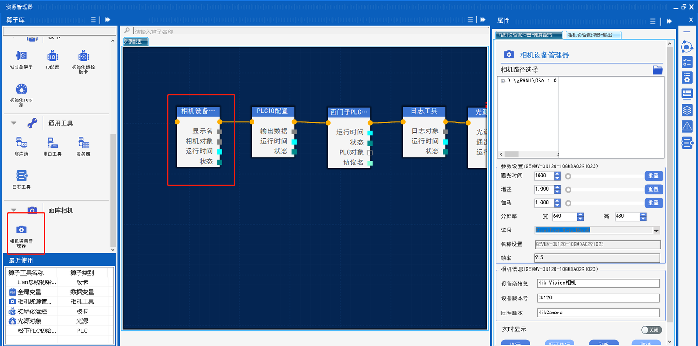 根据相机型号选择Camera文件夹中对应的驱动库,设备使用海康相机,使用HIKGigECamera.dll加载显示到相机资源管理器列表,点击执行打开相机,完成相机连接。