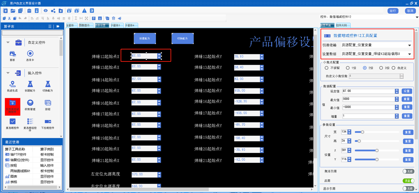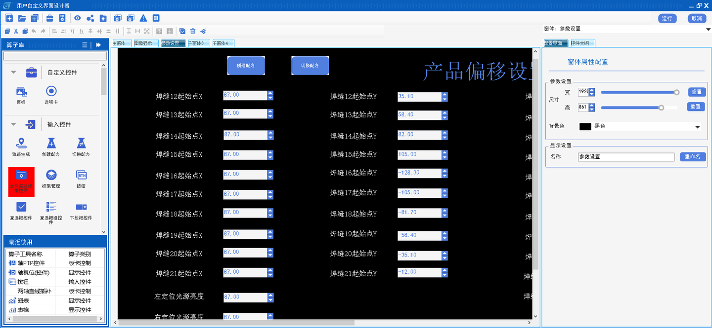 设置基础焊接位置:用于设置标准的软包电池PCB板角点到焊接点的位置,通过数值增减控件实现,例如焊缝12起始X,引用焊缝12起始X变量,当修改此控件值同步给到变量中,光源亮度设置同样使用数值增减控件实现