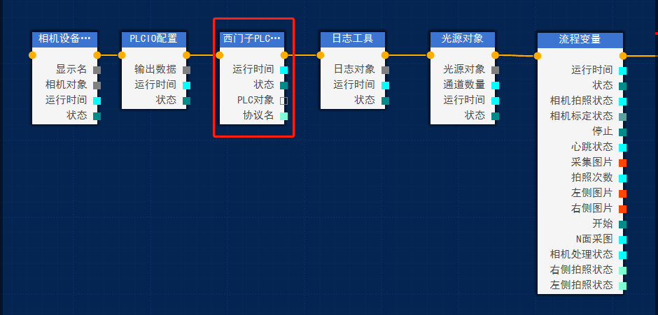 步骤7.读取PLC指令:通过西门子PLC寄存器读取算子读取指令,算子引用西门子PLC初始化以及PLCIO配置输出资源,添加需读取的寄存器地址算子基于已完成的 PLC 初始化建立通信连接实现读取,并输出读取结果