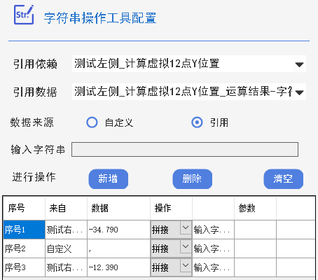 计算出虚拟点XY坐标后通过字符串操作算子将X和Y值拼接成2D坐标格式,算子数据来源选择引用,引用运算结果的字符串格式添加虚拟X值,数据来源修改为自定义,输入“,”进行添加,再将数据来源切换为引用,添加虚拟Y值,执行输出字符串格式的“X,Y”