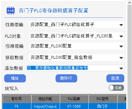 第二步:配置PLC寄存器地址资源以及连接西门子S71500PLC,通过PLCIO配置和西门子PLC初始化算子实现