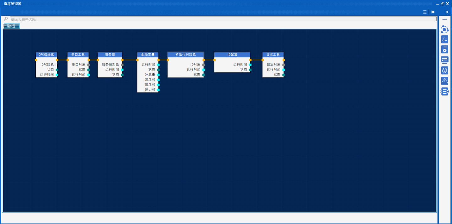 3.打开后可以看到搭建好的资源管理器、主任务设计器以及HMI界面,资源管理器主要实现了硬件资源配置和变量定义。