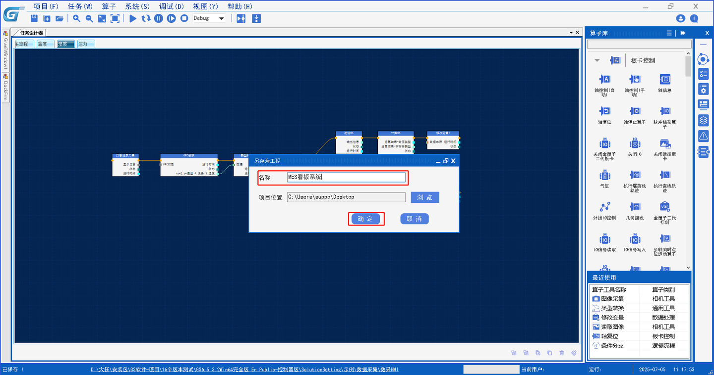 4.通过另存为按钮将程序另存为自己的工程,顶部菜单栏项目按钮中包含另存为功能,重命名后点击选取存取路径,点击确定即可