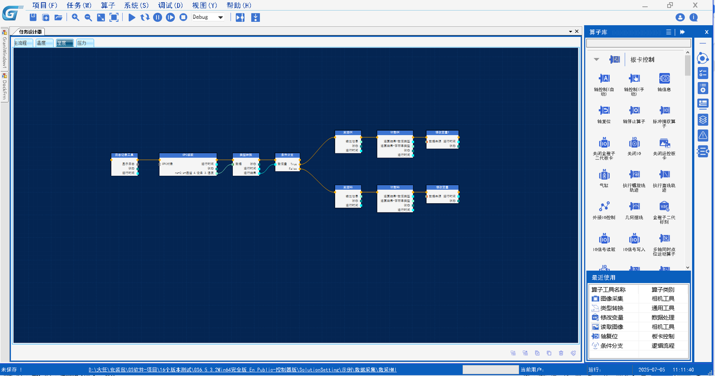 以数据采集内的数采案例为例,此案例其主要功能是通过IO控制触发,使用OPC通讯,读取温度、湿度、压力并将数据显示UI界面,并判断结果是否满足要求的数采看板系统。