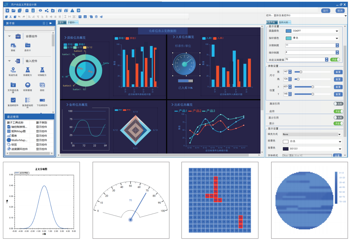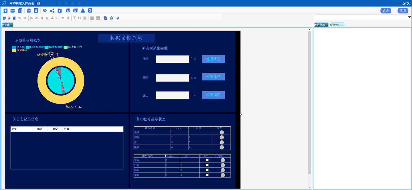 GraniStudio零代码平台包含HMI人机交互设计器,人机交互设计器了数百个简单易用的精美控件,包括按钮、标签、文本框、选择框、图片框、文件对话框、仪器仪表、 报表、图表、表格、运动控制控件、机器视觉控件等,可满足数据采集、运动控制、机器视觉、数据分析、数据仿真等各种工业场景的软件开发要求,通过平台HMI可实现零代码生产监控看板。