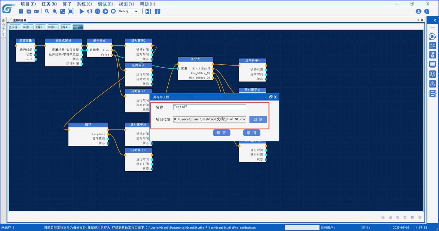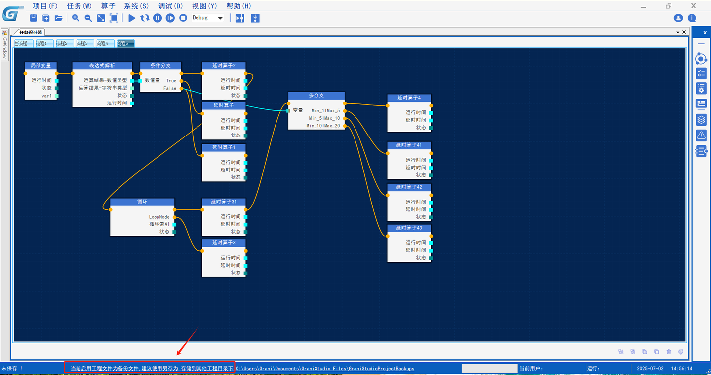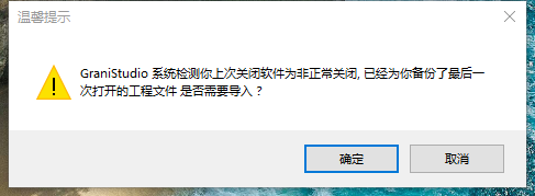 GraniStudio零代码平台当上次关闭程序处于非正常关闭状态下,将提示是否启用备份文件,点击确定按钮后将打开备份文件。