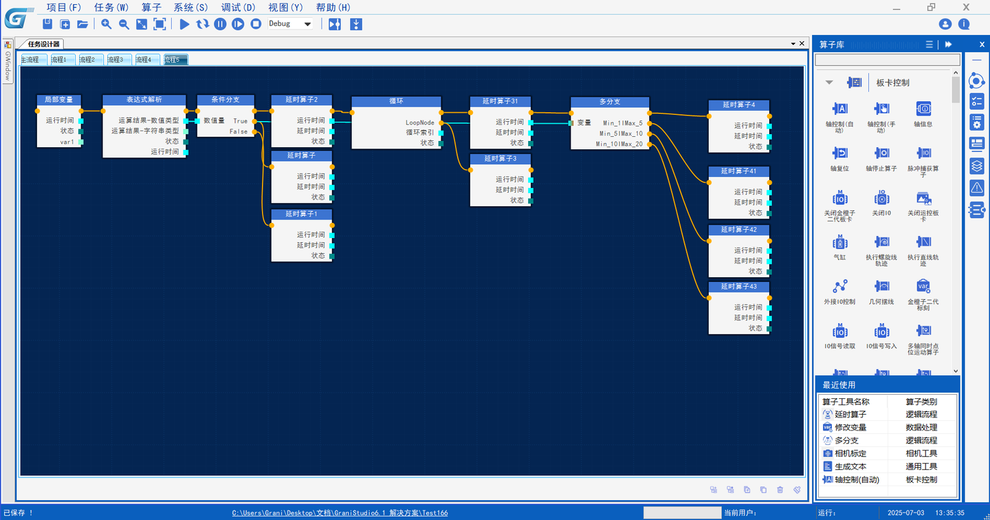 用户通过“主任务设计器”拖拽功能算子(如轴控制算子、光源开关算子),以数据流连接方式构建控制逻辑,无需编写一行代码。