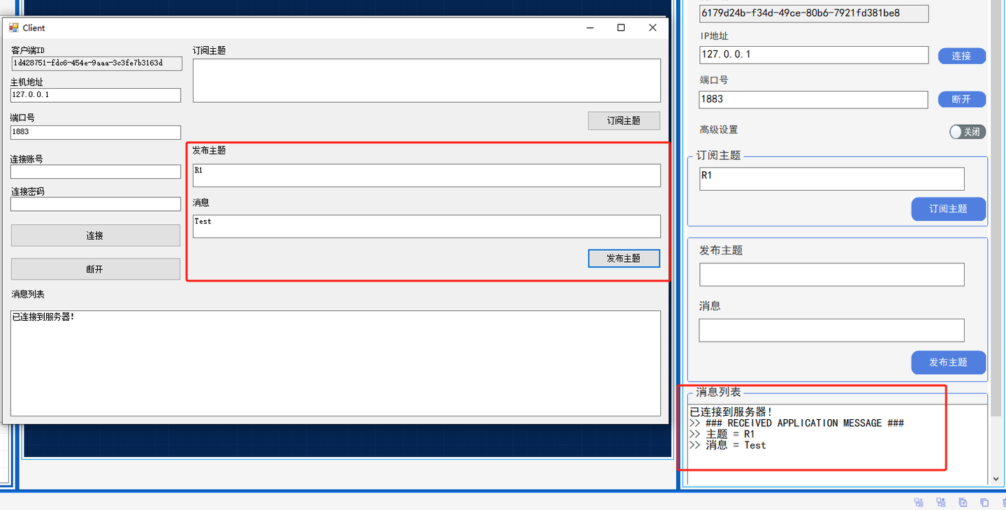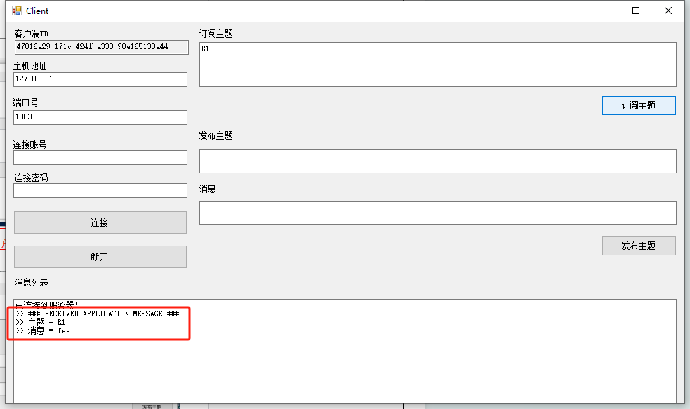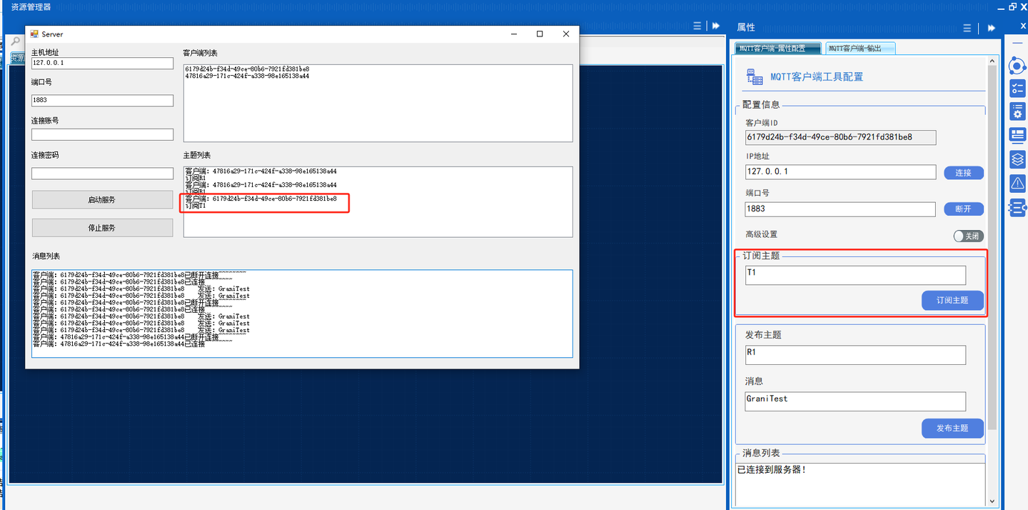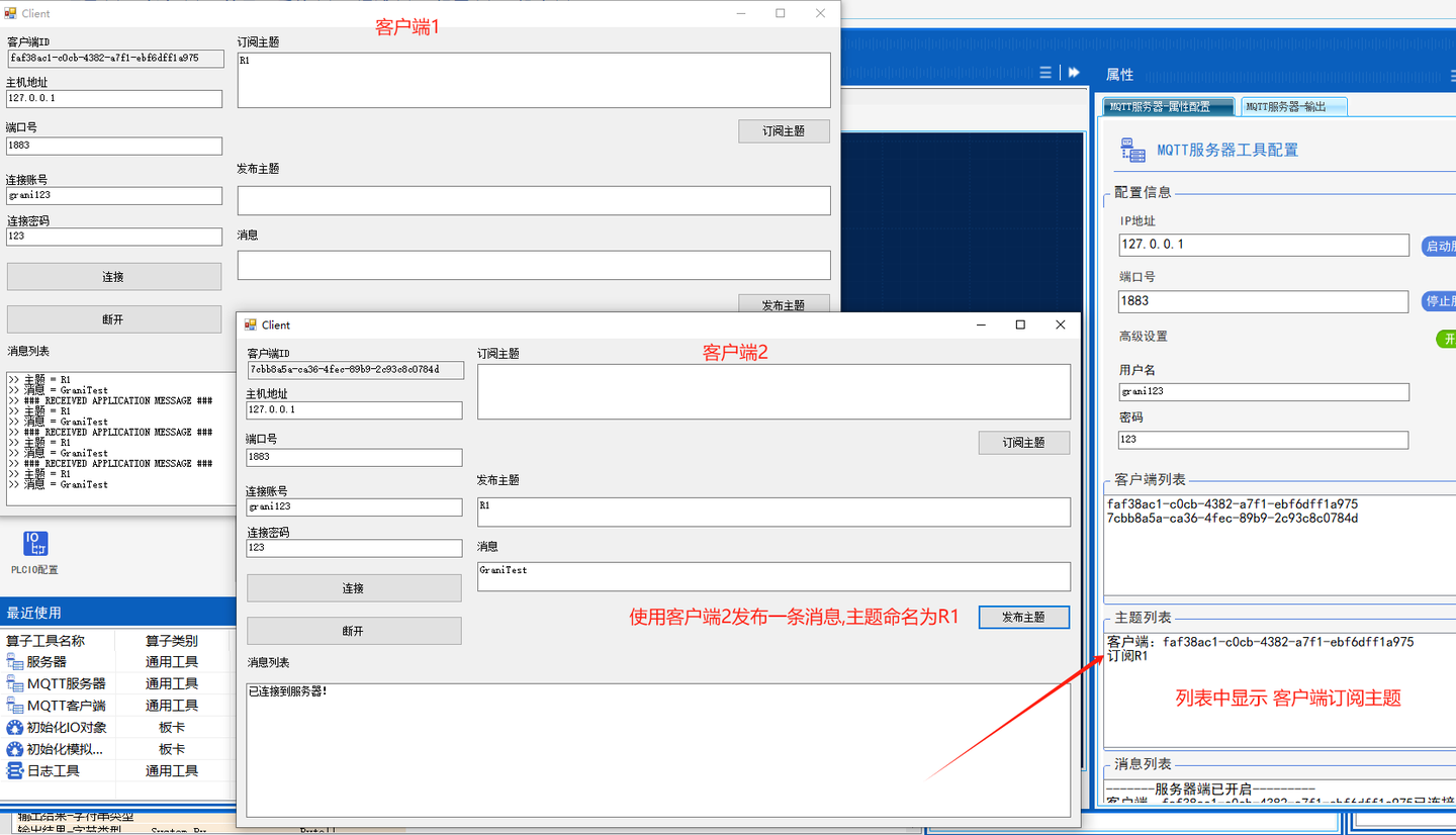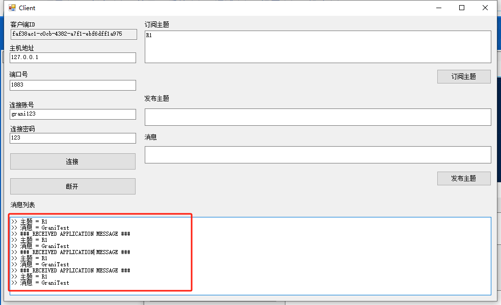 因为客户端2订阅R1主题,发送文本发送的主题为R1 消息为GRaniTest。正常发送主题消息