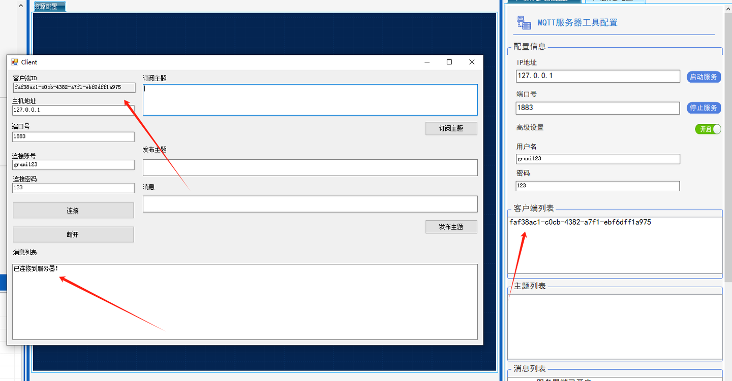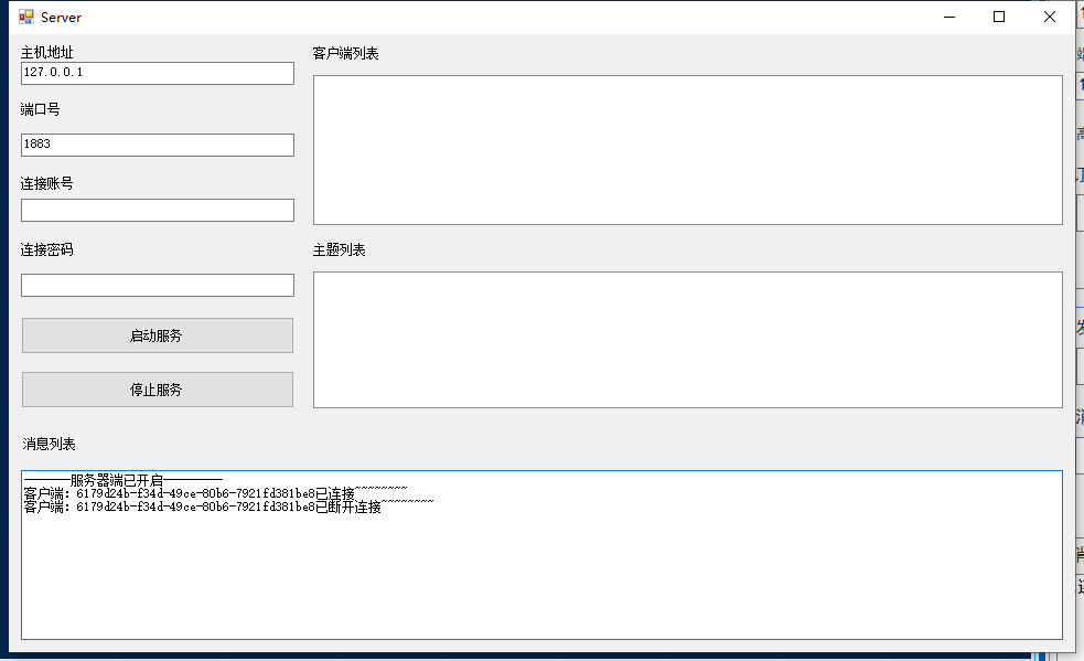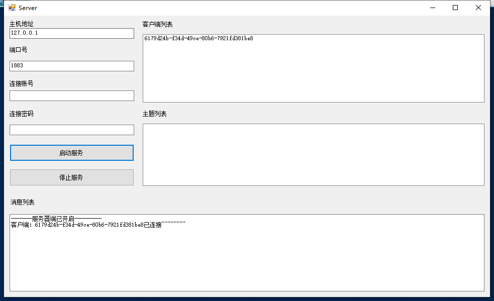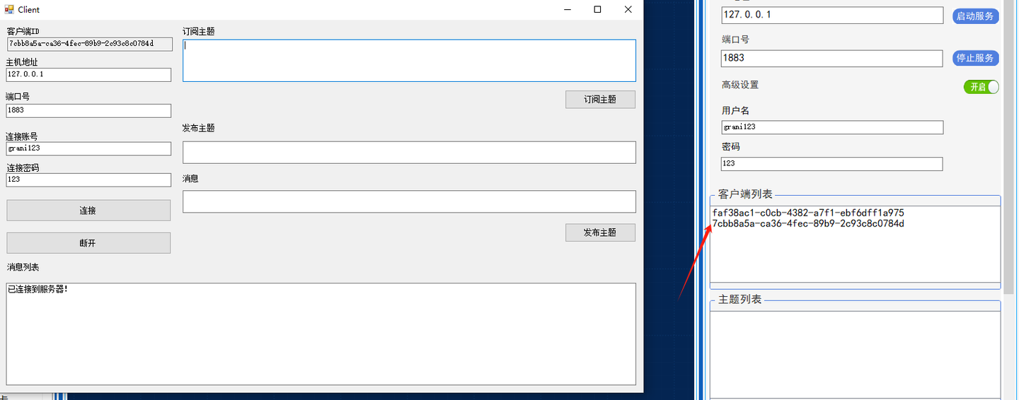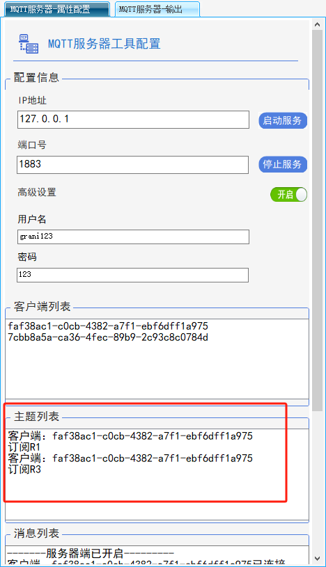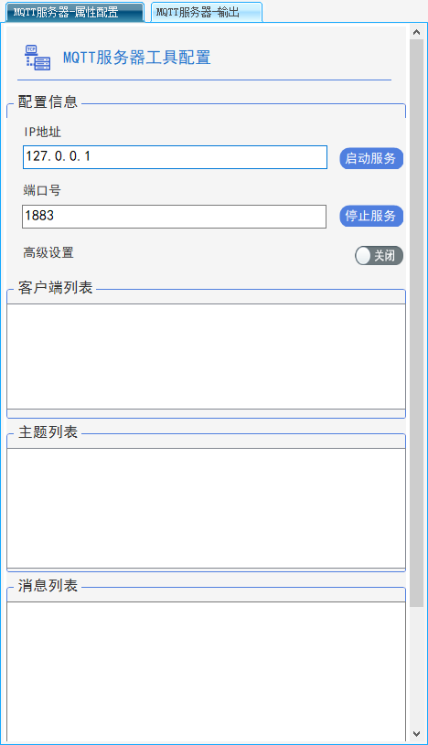 通过主界面可配置IP地址和端口号.然后选配高级设置是否启用密码功能,连接时是否需要验证账号密码,并在列表中支持显示客户端连接列表和主题列表,消息列表方便用户调试使用。