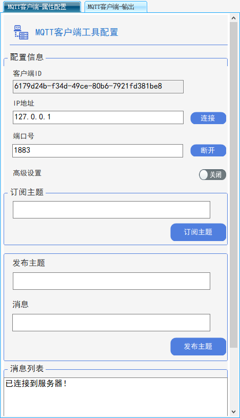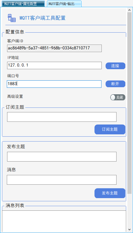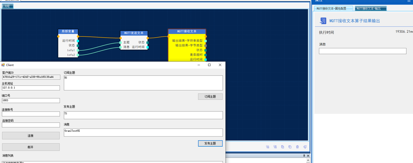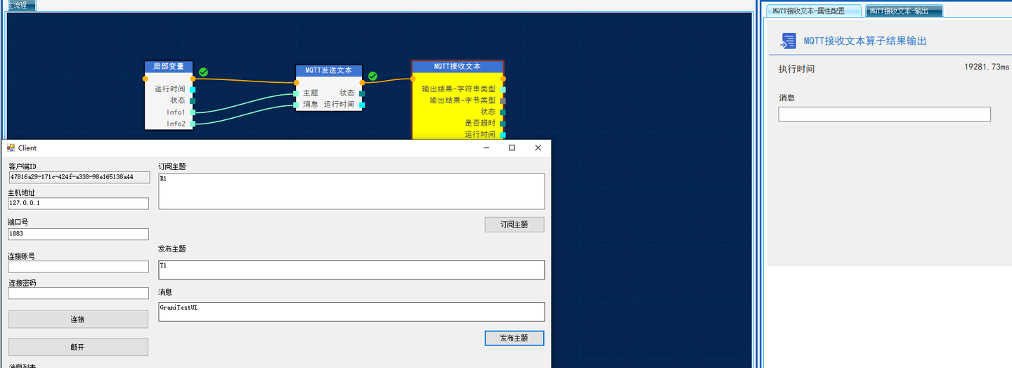 算子内部自动分配客户端ID,通过主界面输入MQTT服务器IP地址和端口号可连接MQTT服务器,然后选配高级设置是否启用密码功能,连接时是否需要验证账号密码,并支持显示接收消息列表,通过界面可订阅主题和发布主题,实现与MQTT服务器与MQTT其他客户端的通信。