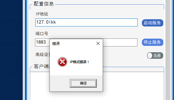 步骤二、配置IP和端口号,IP格式:127.0.0.1 端口号:1883 默认端口号:1883