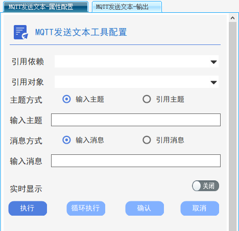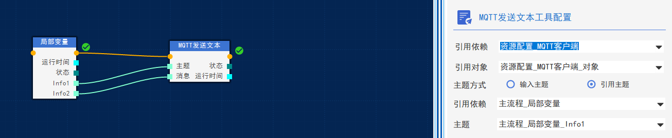 算子内部无需连接操作,通过引用依赖引用MQTT客户端对象即可,实现代理客户端对象发布主题消息功能,通过界面配置可配置主题,可引用主题和手动输入主题,也可引用消息和手动输入消息两种方式。