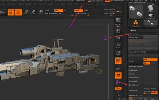 建立的低模面数一般很低,不满足zb雕刻的需求,这是就需要使用zb的dynamic mesh工具,对模型进行细分.