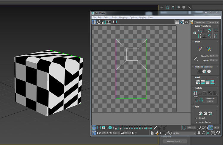 这是一个示例,如果您在UV解包中严重扭曲多边形会发生什么。此多维数据集上的纹理与前面的示例没有什么不同,但是您可以看到它已被拉伸并变形。但是,缺少接缝确实意味着图案排成一行并围绕立方体的边缘,但是在这种情况下,付出的代价是不值得的。